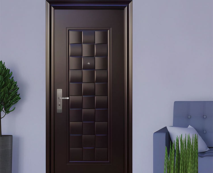 Puerta de seguridad fabricada de acero con laminado en madera, cerradura tradicional, bisagras de 180º y manija exterior de acero.